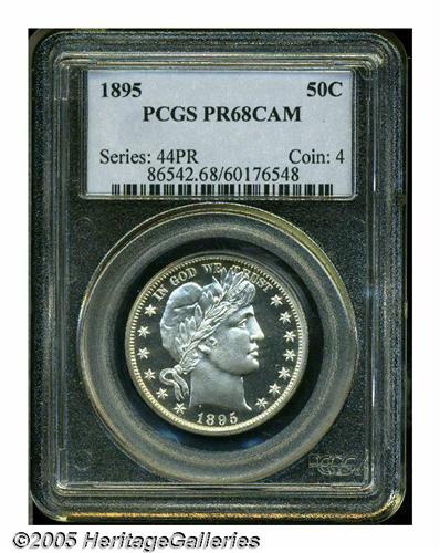 <B>1895<50C> PR68 Cameo PCGS.</B></I> The 1895 is one of the most popular and widely collected years in U.S. numismatics, similar to 1873, 1875, and 1877. This year's notoriety, of course, is derived from the lack of business strike Silver Dollar production and availability of only proofs for this year and in that denomination. While this lot is concerned with a proof Half Dollar from that same year, one thing most collectors will recognize is the mintage: 880 pieces for proofs, the same widely known number for the 1895 Silver Dollar.<BR> This is a magnificent proof striking and it is a coin that has been preserved in essentially "as struck" condition. There are no hairlines on either side. The fields are deeply and unfathomably mirrored with pleasing mint frost over the devices, which yields a noticeable cameo contrast. Both sides are fully brilliant according an "as struck" finish. Population: 1 in 68, none finer (6/05).