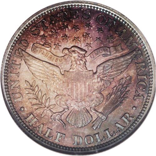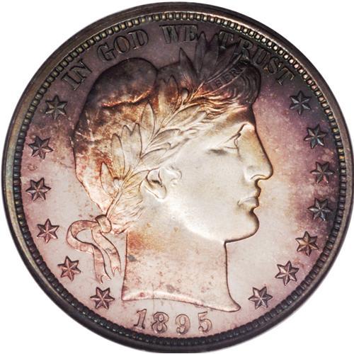 <B>1895<50C> PR68 NGC.</B></I> The cachet of the 1895 date carries over from the famous dollar of that year to the half dollar series as evidenced by the familiar mintage of 880 pieces. This is an immaculately preserved proof that has no hairlines on either side. The fields, of course, are bright and mirror-like and they flash strongly through the considerable toning that is seen on each side. The obverse actually has a brilliant lower half, but that deepens quickly toward the top of that side to reddish-golden and cobalt-blue. The reverse is much deeper in hue with the same reddish-golden color spread evenly over that side and sea-green around the periphery. An outstanding proof half from this widely recognized and respected date. Census: 12 in 68, 0 finer (4/06).