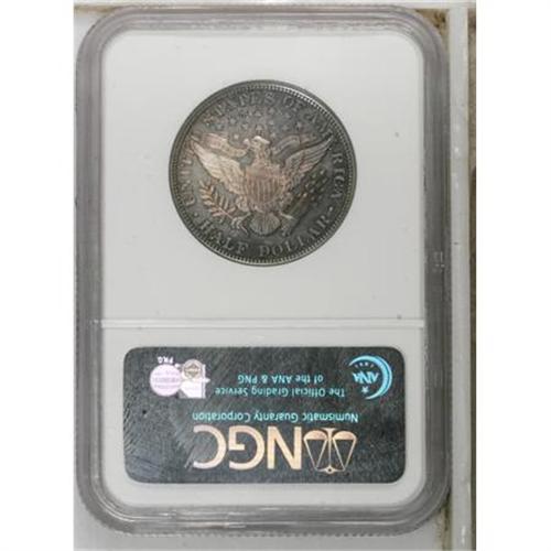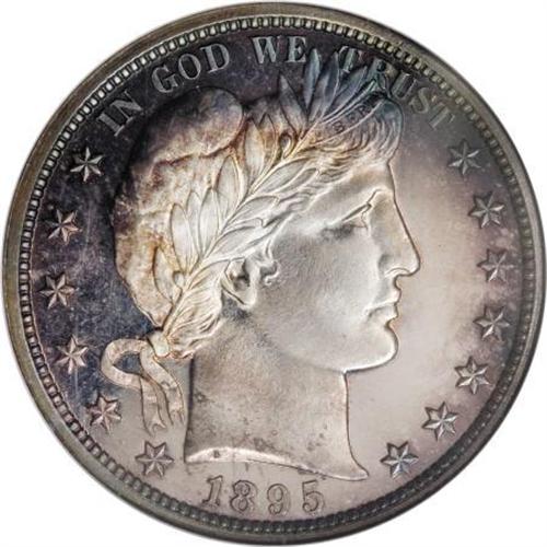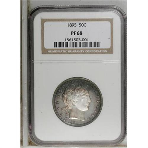 <B>1895 50C PR68 NGC.</B></I> The 880-piece mintage of 1895 proofs is the fourth highest for the Barber half series, and a relatively large number have been certified by NGC and PCGS. This PR68 specimen displays electric-blue and lavender toning around the obverse periphery, and unevenly throughout the reverse. Sharply impressed design features are mildly frosted, and yield good contrast with deeply mirrored fields. The surfaces are unimprovable. Census: 12 in 68, 0 finer (6/07).<BR><BR><b>Shipping:</b> Coins & Currency (<a target="_blank" href="http://www.heritageauctions.com/common/shipping.php">view shipping information</a>)