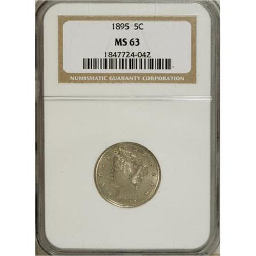 <B>1895 5C MS63 NGC.</B></I> NGC Census: (70/164). PCGS Population (83/155). Mintage: 9,979,884. Numismedia Wsl. Price for NGC/PCGS coin in MS63: $154. (#3856)<BR><BR><B>Coin Engraver:</B> Charles E. Barber<BR><BR><b>Shipping:</b> Coins & Currency (<a target="_blank" href="http://www.heritageauctions.com/common/shipping.php">view shipping information</a>)