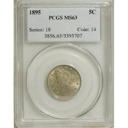 <B>1895 5C MS63 PCGS.</B></I> PCGS Population (84/164). NGC Census: (71/165). Mintage: 9,979,884. Numismedia Wsl. Price for NGC/PCGS coin in MS63: $180. (#3856)<BR><BR><B>Coin Engraver:</B> Charles E. Barber<BR><BR><b>Shipping:</b> Coins & Currency (<a target="_blank" href="http://www.heritageauctions.com/common/shipping.php">view shipping information</a>)
