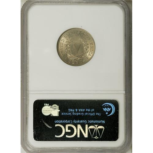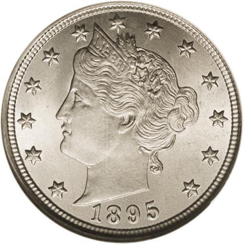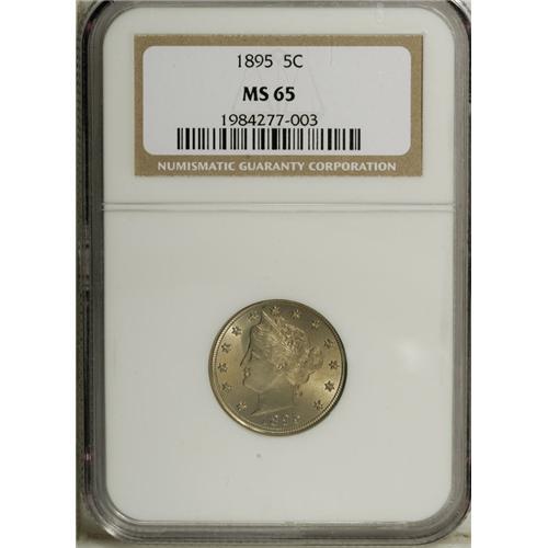 <B>1895 5C MS65 NGC.</B></I> The luster on both sides is bright and satiny, being accented in delicate golden-orange and dove-gray patina. A tiny mark on Liberty's neck cannot be seen without magnification. Although the mintage of Liberty nickels this year approached 10 million pieces, surviving Gems are a scarce commodity. Census: 37 in 65, 10 finer (12/06).<BR><BR><b>Shipping:</b> Coin/Currency (<a target="_blank" href="http://www.heritageauctions.com/common/shipping.php">view shipping information</a>)