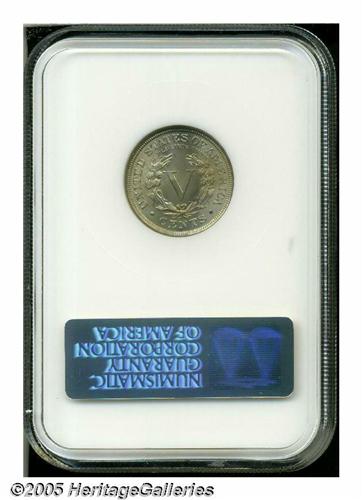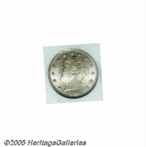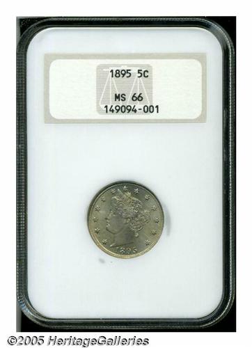<B>1895<5C> MS66 NGC.</B></I> Attractive warm gold and tan patina with a few lighter streaks of color on the obverse. Unusually well defined overall, a small abrasion near the top of the wreath on the reverse is the only distraction on this coin's Gem surfaces. Population: 8 in 66, 0 finer (6/05).