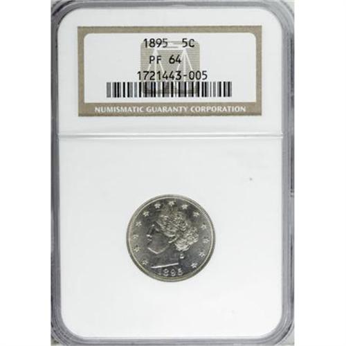 <B>1895 5C PR64 NGC.</B></I> NGC Census: (146/137). PCGS Population (228/88). Mintage: 2,062. Numismedia Wsl. Price for NGC/PCGS coin in PR64: $260. (#3893)<BR><BR><B>Coin Engraver:</B> Charles E. Barber<BR><BR><b>Shipping:</b> Coins & Currency (<a target="_blank" href="http://www.heritageauctions.com/common/shipping.php">view shipping information</a>\)