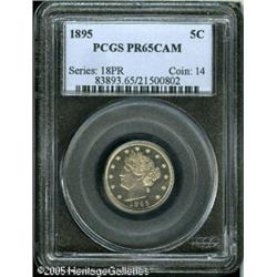 <B>1895 5C PR65 Cameo PCGS.</B></I> A beautiful cameo Gem proof, with milky patina in the fields, and sparkling, highly reflective surfaces. A lovely black and white coin, fully struck and pristine. Population: 13 in PR65 Cameo, 7 finer (1/05). Lot:5927