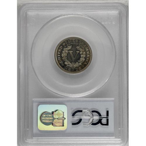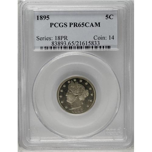 <B>1895<5C> PR65 Cameo PCGS.</B></I> Fully struck and carefully preserved, with a thin coating of milky patina on both obverse and reverse, lovely olive-gray coloration, and nice reflectivity in the fields. Mild cameo contrast enhances the overall appearance of this pleasing, conditionally scarce Gem proof. Population: 13 in 65 Cameo, 7 finer (5/06).