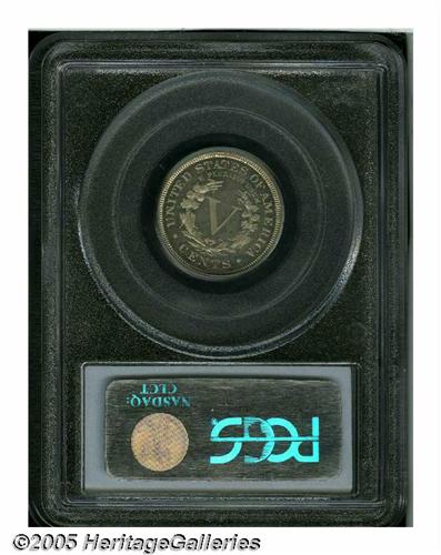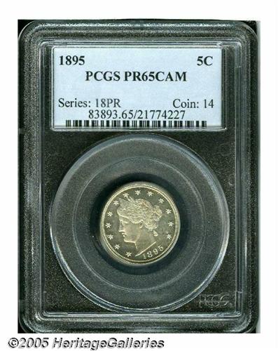<B>1895<5C> PR65 Cameo PCGS.</B></I> Mildly frosted with coating of milky patina on both sides. There is a curly lintmark in the upper left obverse field, to the immediate left of Liberty's forehead, a feature of the coin that was present before it left the Mint. Population: Population: 13 in 65, 7 finer (6/05).