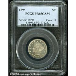<B>1895 5C PR65 Cameo PCGS.</B></I> The mildly frosted devices are framed by watery, reflective fields, that have a coating of milky, not unattractive toning on both sides. There is a curly lintmark (as struck) in the upper left obverse field, to the immediate left of Liberty's forehead, a feature of the coin that was present before it left the mint. Lot:5928