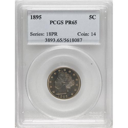 <B>1895 5C PR65 PCGS.</B></I> PCGS Population (86/15). NGC Census: (99/38). Mintage: 2,062. Numismedia Wsl. Price for NGC/PCGS coin in PR65: $520. (#3893)<BR><BR><b>Shipping:</b> Coins & Currency (<a target="_blank" href="http://www.heritageauctions.com/common/shipping.php">view shipping information</a>)
