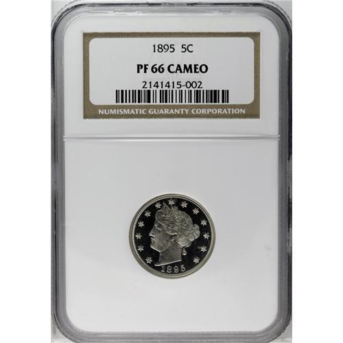 <B>1895<5C> PR66 Cameo NGC.</B></I> Dramatic contrast between the radiant devices and glass-like fields proclaims the eye appeal of this penetratingly struck Premium Gem. Faint tan toning embraces the central reverse, but the remainder of this beautiful piece is brilliant. Census: 5 in 66 Cameo, 1 finer (6/06).<BR><I>From The Mulholland Collection.</B></I>