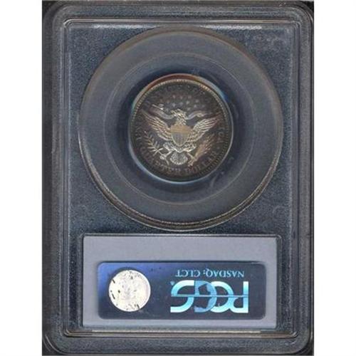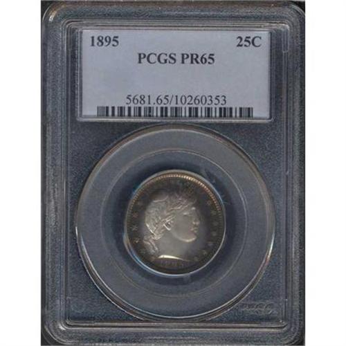 <b>1895 Barber Quarter Dollar. PCGS graded Proof 65.</b> Lovely spotlight toning features pearl gray and white centers with deep, original and strikingly attractive peripheral toning as a halo surrounding this. Bold features throughout, and a Gem. Only 880 Proofs made <b>(PCGS # 5681)</b>