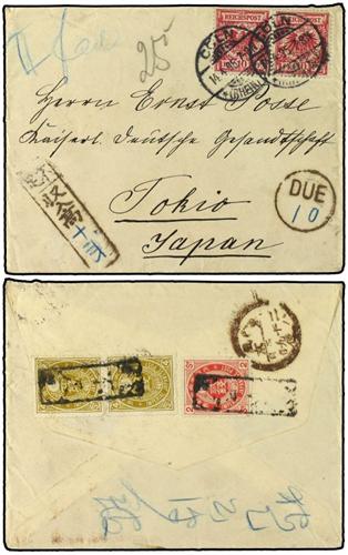 1895 COLN a TOKIO (Japón). 10 pf carmín (2) tasada a la llegada con 10 sen pagados con sellos japoneses de 2 sen tosa y 4 sen bistre (2). Magnífico y raro franqueo.