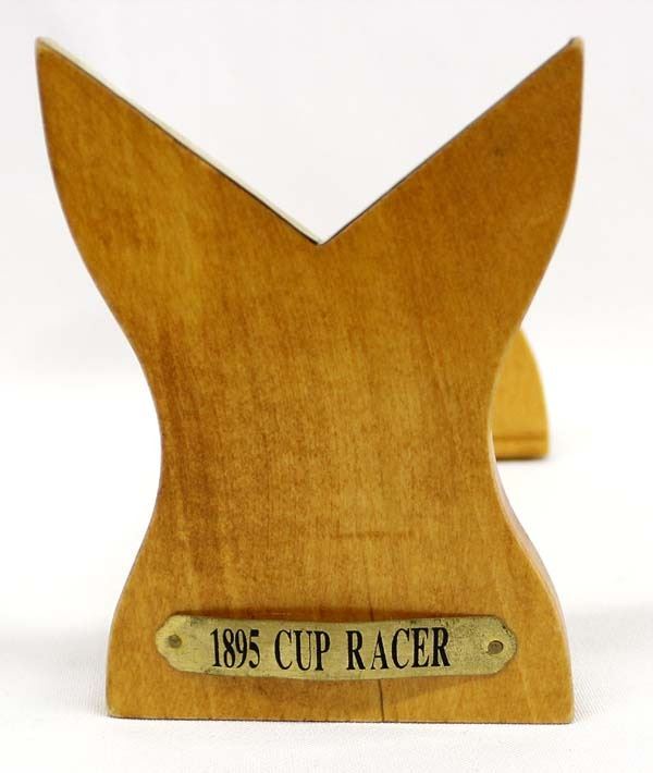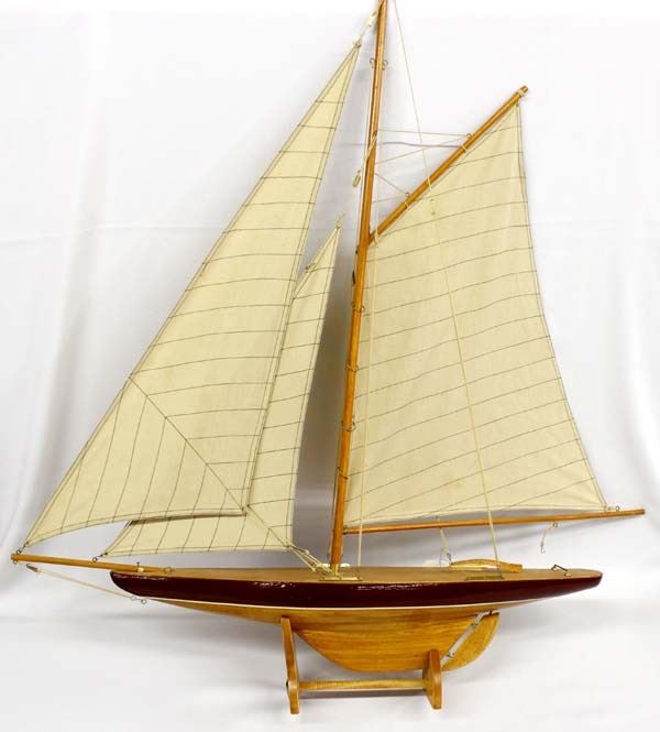 1895 Cup Racer ''Defender'' Model Yacht, comes on wood stand, measures 30''L x 36.5''H x 5.25'', canvas mast, brass hardware