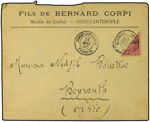 1895 Envelope from CONSTANTINOPLE to BEYROUTH bearing French Levant 2 pi on 50 c rose (bi-sect) (Yvert 6) tied by CONSTANTINOPLE TURQUIE double ring with French Post Office Beyrouth Syrie double ring on reverse. Very rare use paying the 1 piastre rate.