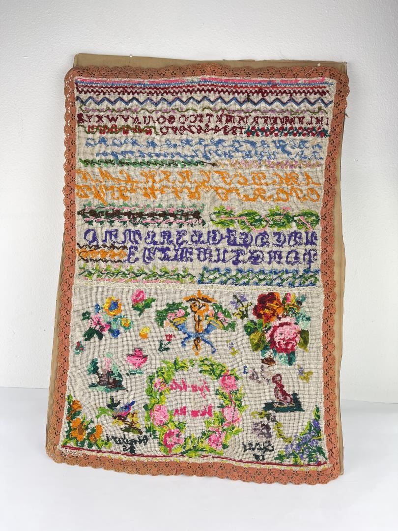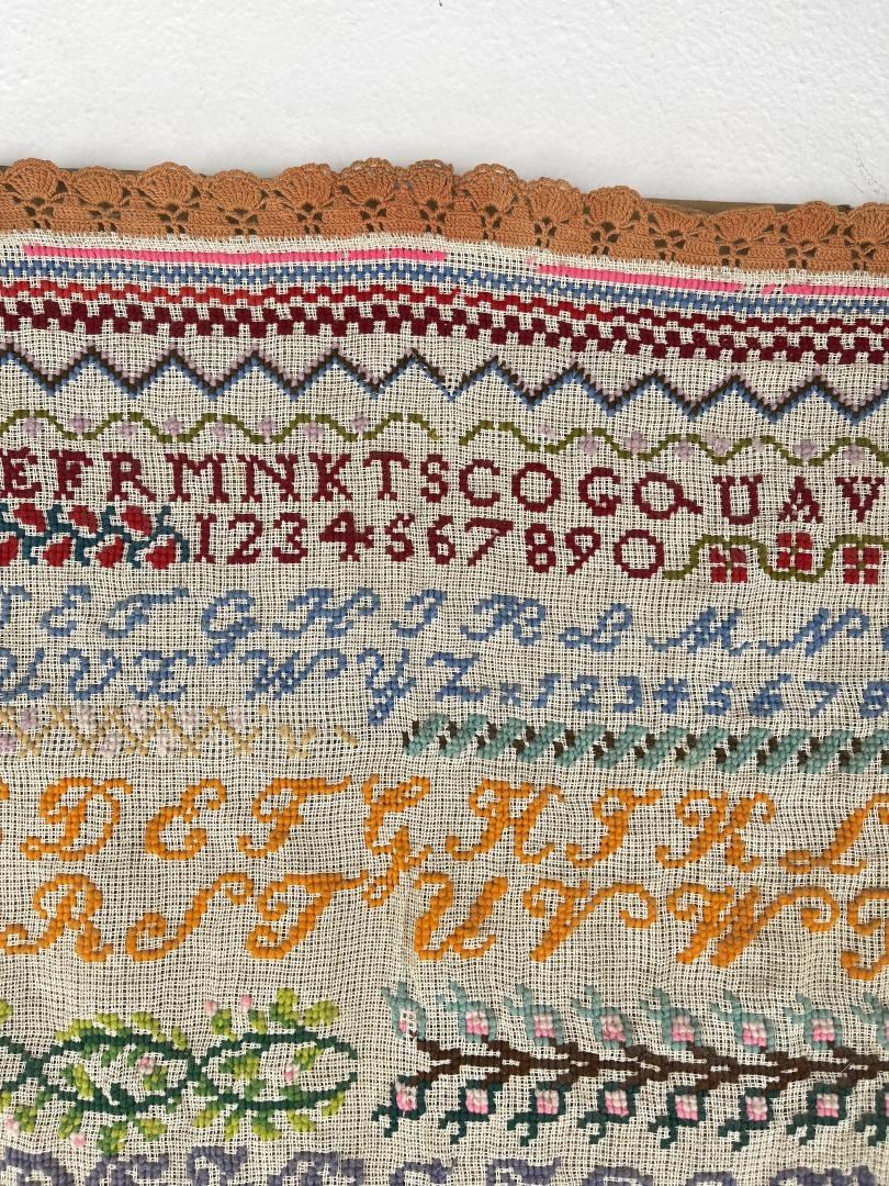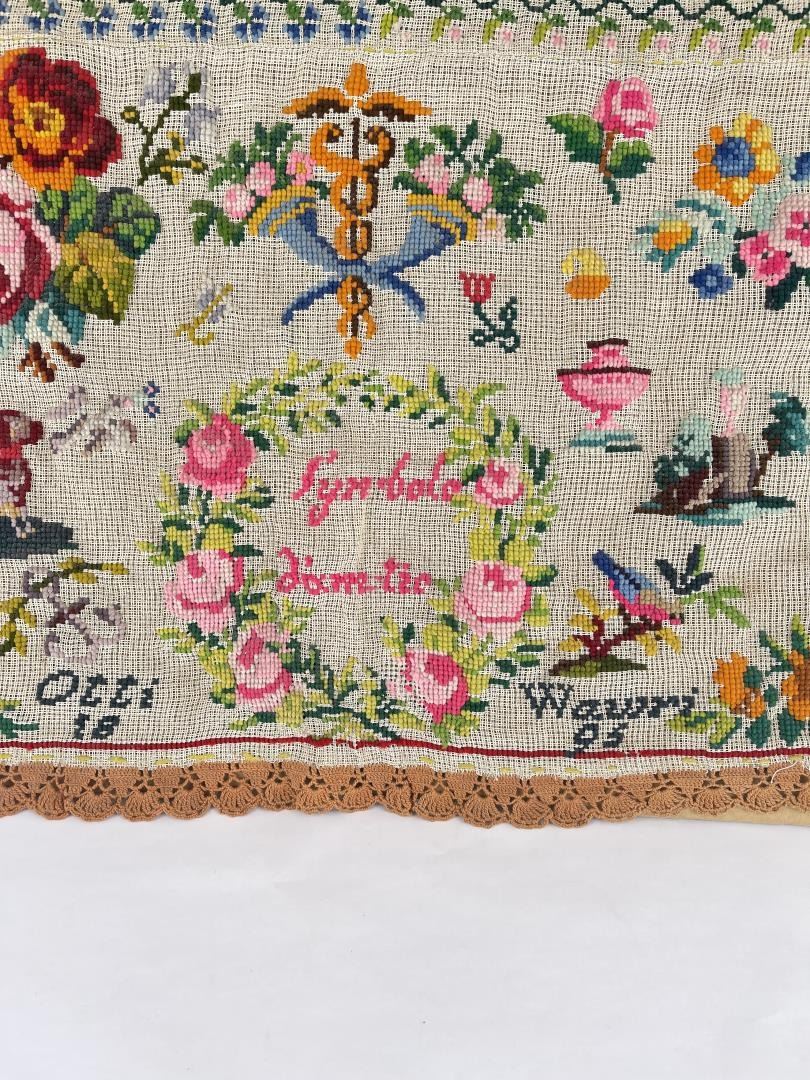 Very nice sampler. Has the Caduceus, and a nicely done dog as shown. Includes several forms of script, florals, and more. Dated 1895. European in origin. 23" by 33.75".
