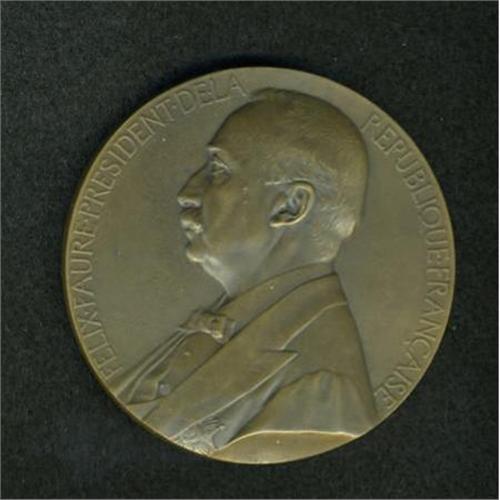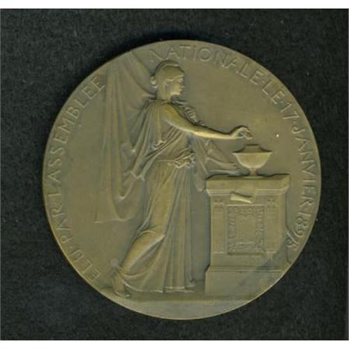 <B>1895 Felix Faure Presidential Medal</B></I> Bronze, 68.5 mm, 143.4 gm. Paris Mint. Edge with cornucopia and BRONZE markings, double stamped. Dies by J.C. Chaplain. Obverse: bust left of Faure. Reverse: allegorical female carrying flag drops election ticket into vase, scroll beneath vase is inscribed CONGRES. Trivial carbon, and a pair of tiny bumps, perhaps as made, on the cheekbone of Faure.<BR><BR><b>Shipping:</b> Coins & Currency (<a target="_blank" href="http://www.heritageauctions.com/common/shipping.php">view shipping information</a>)