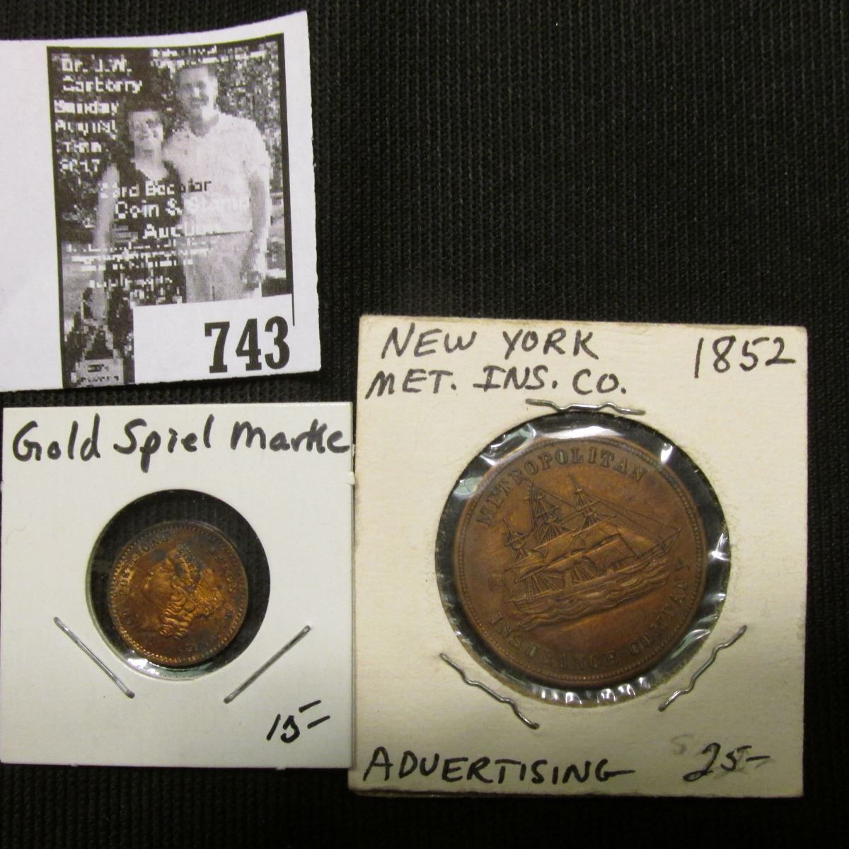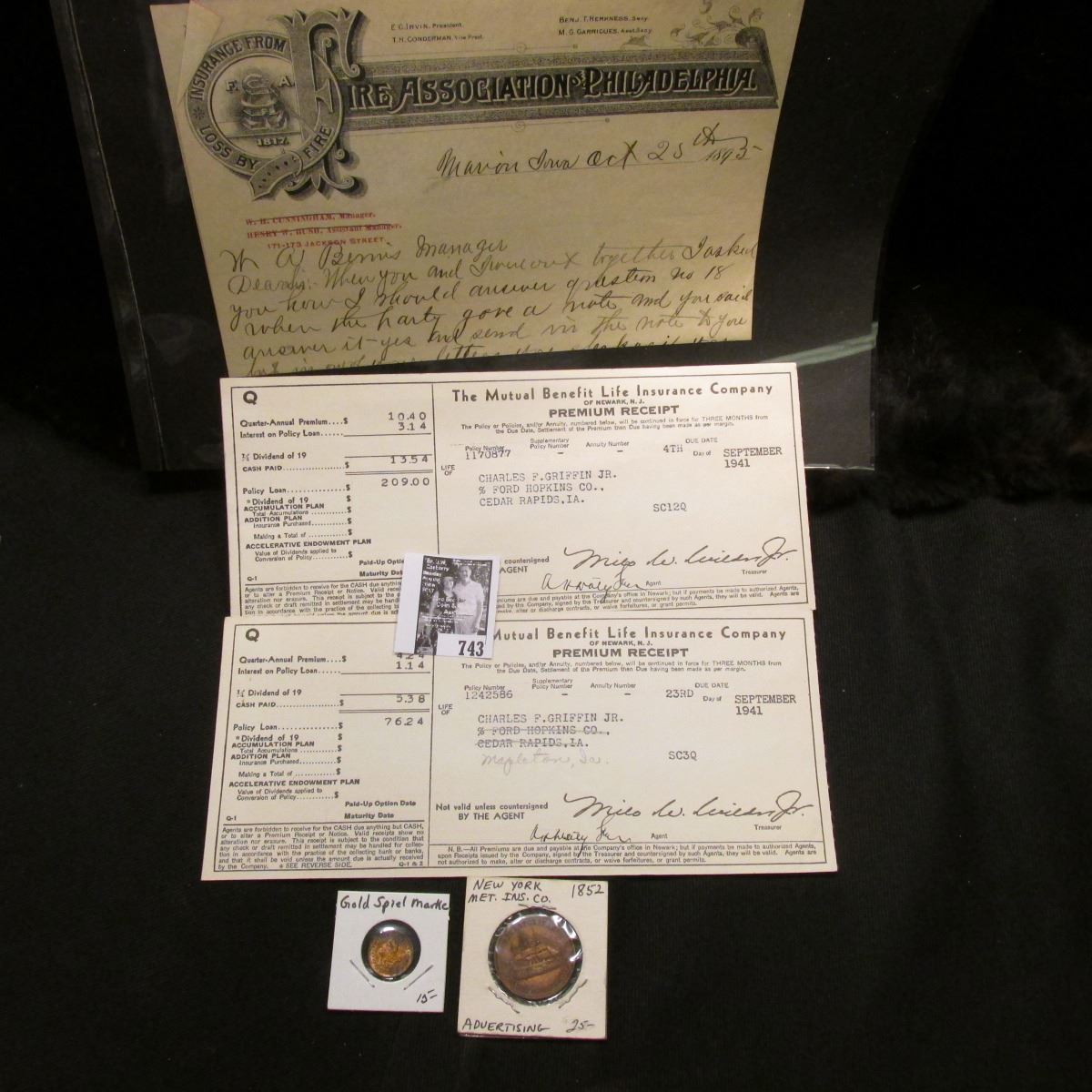 1895 "Fire Association of Philadelphia" Invoice; 1941 Invoice "The Mutual Benefit Life Insurance Company" receipt; and a nicely toned gold-colored Spiele Marke; & an 1852 New york Metropolitan Insurance Co.Copper medal.