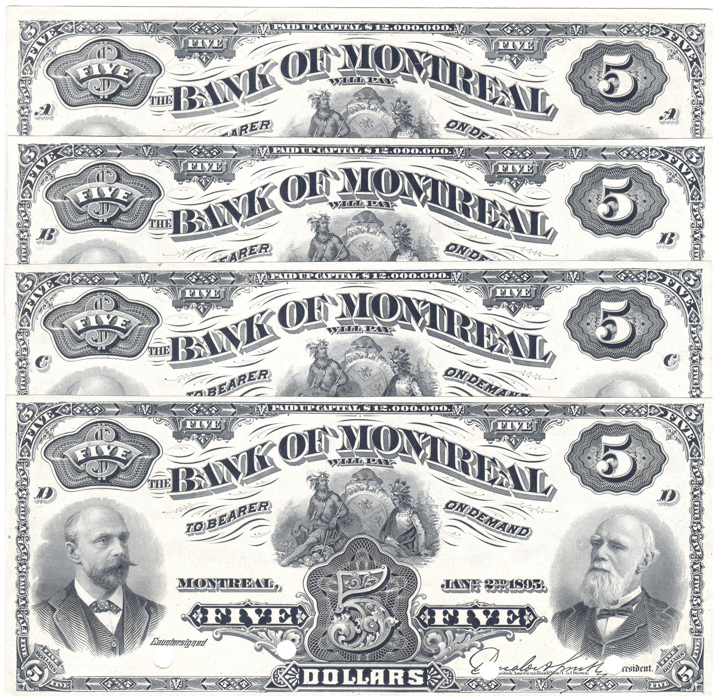 1895 Five Dollars Bank of Montreal, AU, 505-44-02Pa, Black & White Face Proof Set of 4 with Letter A, B, C & D. Rarely offered on the market.