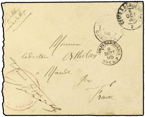 1895 French Occupation Military mail. Envelope to FRANCE endorsed Troupes du Mekong Commandant des Troupes cancelled Corps Exped. Cambodge double ring with military cachet TROUPES DE MEKONG KHONG in red and signed by the "Commandant" at Khong with CORPS EXP. TONKIN LIGNE N.2 (Salles 1954) datestamp routed via Saigon with arrival cancel. Very rare item of occupation mail.
