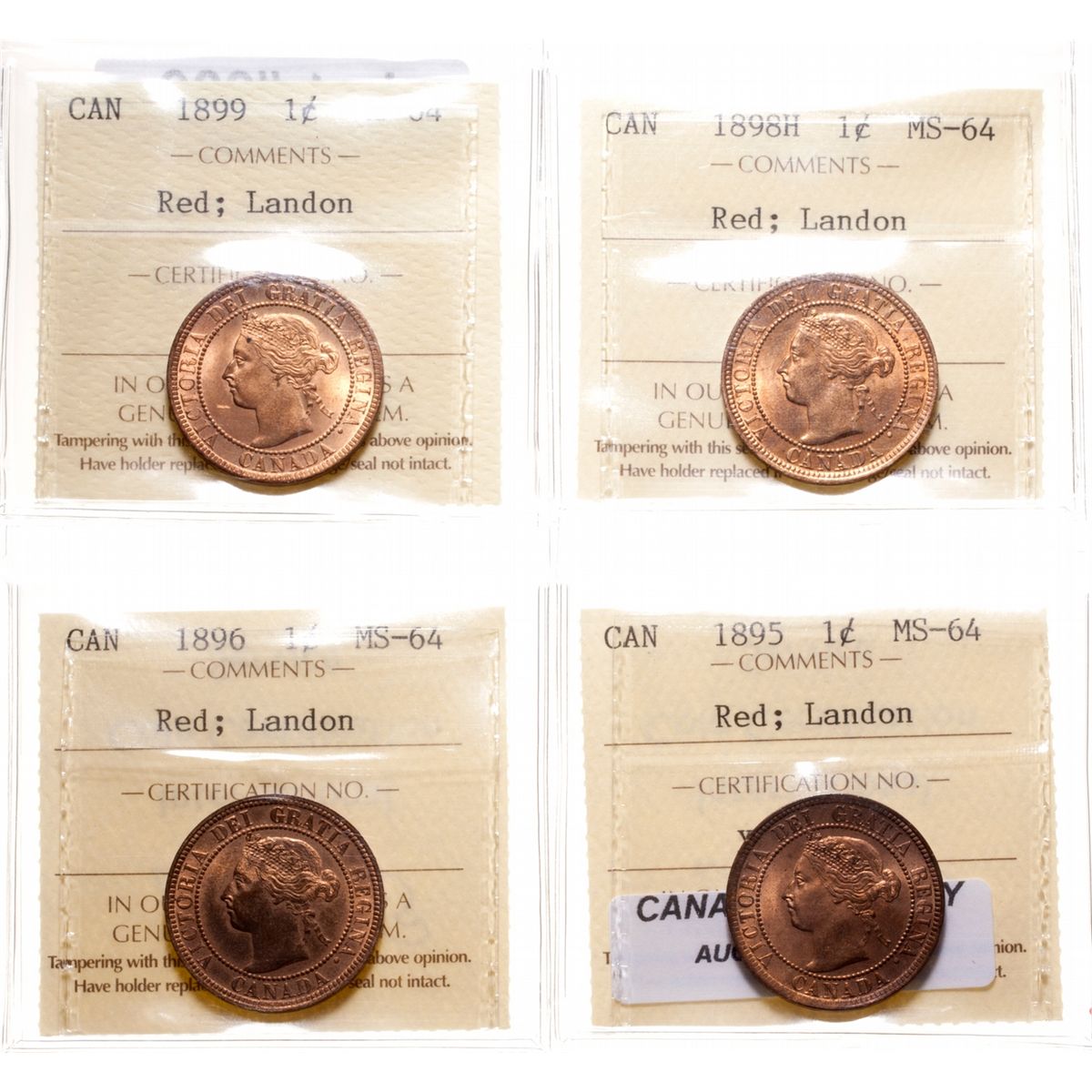 1895. ICCS Mint State-64. Red. 80% even red-orange luster; 1896. ICCS Mint State-64. Red. 70% even red-orange luster; 1898-H. ICCS Mint State-64. Red. 95% even red-orange luster; 1899. ICCS Mint State-64. Red. 90% even red-orange luster. Lot of four (4) large cents.