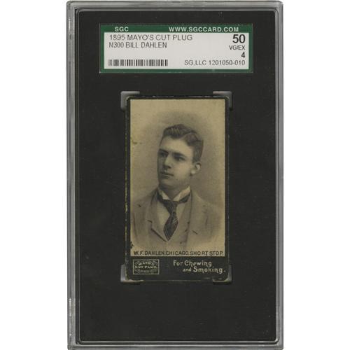 <B>1895 Mayo's Cut Plug N300 Bill Dahlen SGC VG/EX 50.</B></I> Terrific numbers throughout a twenty-one season career have led many to insist that Dahlen deserves Cooperstown enshrinement, and that argument appears quite valid. Certainly it would do wonders for the value of this attractive card, which now is still considered a "common." Typical edge and corner wear, but fine visual appeal.<BR><BR><b>Shipping:</b> Sportscard (<a target="_blank" href="http://www.heritageauctions.com/common/shipping.php">view shipping information</a>)
