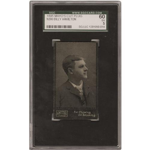 <B>1895 Mayo's Cut Plug N300 Billy Hamilton SGC EX 60.</B></I> Fine representation celebrates the talents of Hall of Famer "Sliding Billy," who topped the National League with an outrageous total of ninety-seven stolen bases the year this card was issued. Very light edge and corner wear sets this example apart from the pack, with none ever topping our example on the SGC population charts.<BR><BR><b>Shipping:</b> Sportscard (<a target="_blank" href="http://www.heritageauctions.com/common/shipping.php">view shipping information</a>)