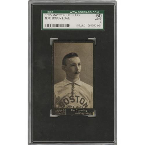 <B>1895 Mayo's Cut Plug N300 Bobby Lowe SGC VG/EX 50.</B></I> Strong representation from the Boston Beaneaters second baseman exhibits just the edge and corner wear typical of this ancient issue. Only three examples have ever surpassed the offered card on the SGC population charts.<BR><BR><b>Shipping:</b> Sportscard (<a target="_blank" href="http://www.heritageauctions.com/common/shipping.php">view shipping information</a>)