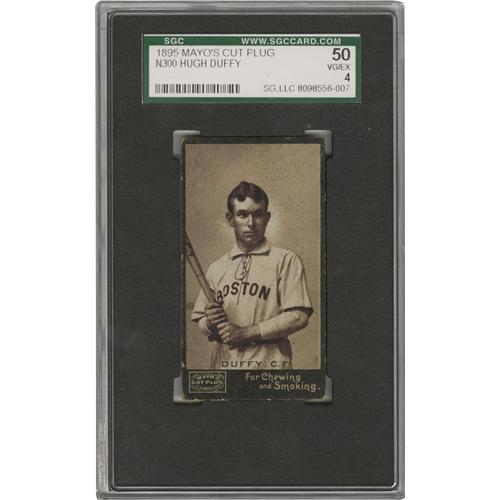 <B>1895 Mayo's Cut Plug N300 Hugh Duffy SGC VG/EX 50.</B></I> Tough Hall of Fame card pictures Sir Hugh early in his storied career. The Boston Beaneaters star appears between perfectly calibrated borders, with clean surfaces front and back. Typical corner wear must be forgiven.<BR><BR><b>Shipping:</b> Sportscard (<a target="_blank" href="http://www.heritageauctions.com/common/shipping.php">view shipping information</a>)