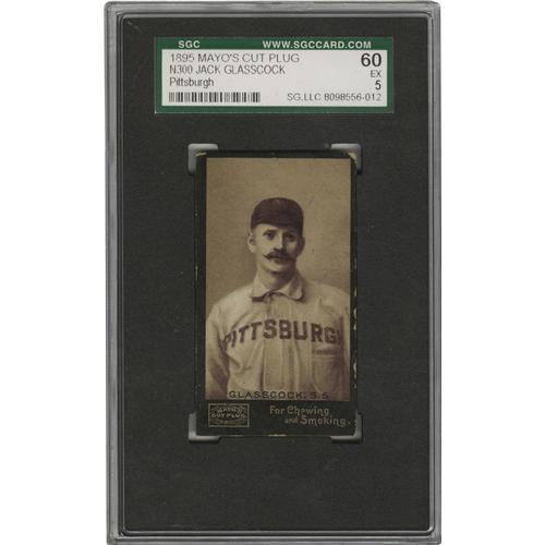 <B>1895 Mayo's Cut Plug N300 Jack Glasscock SGC EX 60.</B></I> Magnificent specimen celebrates Honus Wagner's predecessor at Pittsburgh's shortstop position. Rounded corners and light edge wear put this card near the top of the very few available to grade. Only three have been deemed finer.<BR><BR><b>Shipping:</b> Sportscard (<a target="_blank" href="http://www.heritageauctions.com/common/shipping.php">view shipping information</a>)