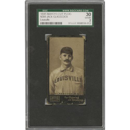 <B>1895 Mayo's Cut Plug N300 Jack Glasscock SGC Good 30.</B></I> Pebbly Jack was considered the best shortstop in history until the arrival of Honus Wagner, and he certainly looks impressive on the face of this rare specimen of the coveted N300. Typical edge and corner wear are to be found, but image area is relatively untouched.<BR><BR><b>Shipping:</b> Sportscard (<a target="_blank" href="http://www.heritageauctions.com/common/shipping.php">view shipping information</a>)
