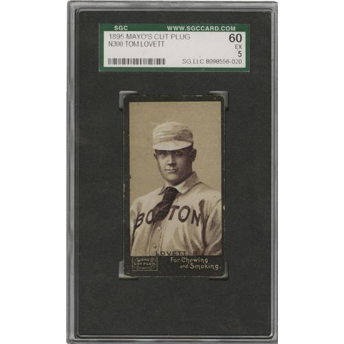 <B>1895 Mayo's Cut Plug N300 Tom Lovett SGC EX 60.</B></I> In fourteen submission attempts, not a single example of this card dedicated to the Boston Beaneaters pitcher has ever surpassed ours on the SGC population charts. A remarkably clean card from this Victorian era issue.<BR><BR><b>Shipping:</b> Sportscard (<a target="_blank" href="http://www.heritageauctions.com/common/shipping.php">view shipping information</a>)