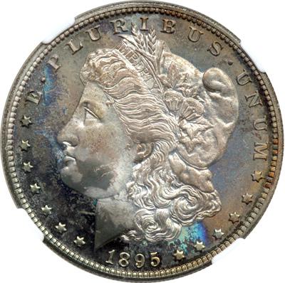 1895 Morgan Dollar. NGC graded Proof 68. A superb gem specimen exhibiting alternating areas of multi-color iridescent toning on each side. Only 880 minted for this key date Proof-only year. Rarest of the rare in the Morgan series, held by all to be the King of the Morgan Dollars and for understandable reasons, only Proofs were minted. Business strikes are unknown. It is from these few specimens that tens of thousands of collectors, if not hundreds of thousands of collectors, must struggle over ownership of the small supply on the market at any one time.
