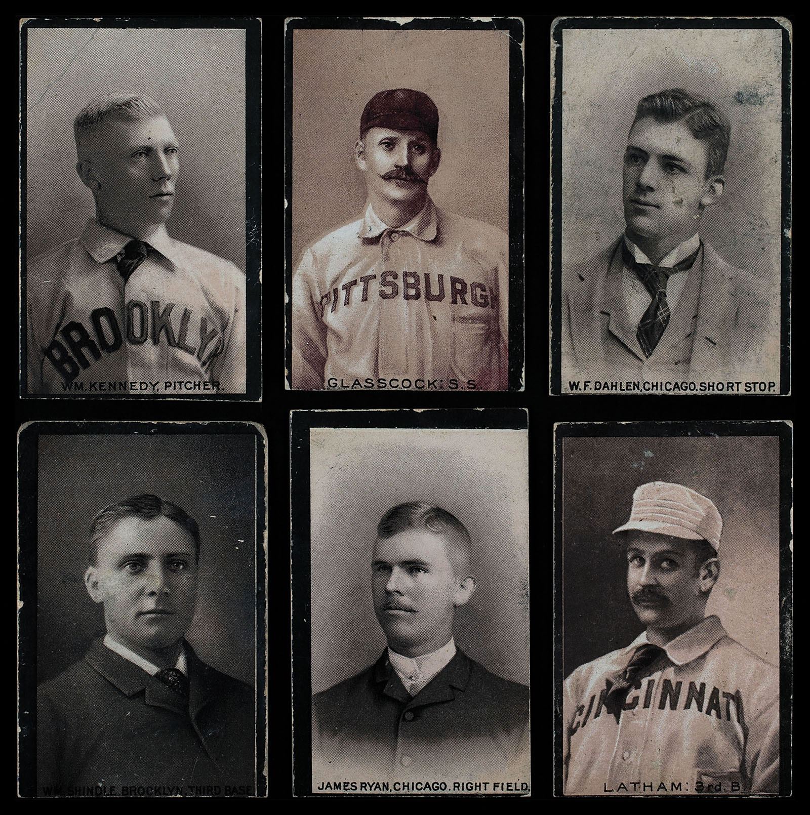 Issued within containers of “cut plug” tobacco, these 19th century cards are rarely seen, and almost never in decent quantity. Normally measuring 2-7/8 x 1-5/8 inches, this group of six cards all have their advertising portion cut off the bottom, and without such these cards appear to be mini-cabinets. Includes: Dahlen, Glasscock, Kennedy, Latham, James Ryan, and Shindle. Generally in good shape for the issue, mostly clean with Kennedy and Shindle having creases.
