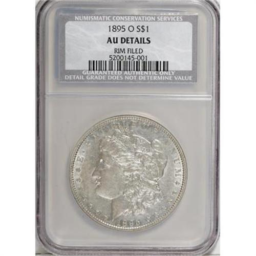 <B>1895-O $1 --Rim Filed--NCS. AU Details.</B></I> Pleasing silver-gray surfaces exhibit traces of luster in the recesses and are quite clean for a coin that has seen some circulation. Nicely defined, save for the usual softness in the centers. Any rim filing is extremely minor. In other words, the interested bidder should not be intimidated by the NCS disclaimer.<BR><BR><B>Coin Engraver:</B> George T. Morgan<BR><BR><b>Shipping:</b> Coins & Currency (<a target="_blank" href="http://www.heritageauctions.com/common/shipping.php">view shipping information</a>)