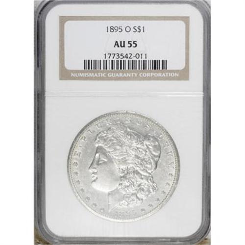 <B>1895-O $1 AU55 NGC.</B></I> The typical grade for this date is XF or AU, with few Mint State survivors. In fact, the price structure is such that AU examples, such as this AU55 coin, are the ideal choice for most collectors. Attractive gray-silver surfaces with nearly full luster.<BR><BR><B>Coin Engraver:</B> George T. Morgan<BR><BR><b>Shipping:</b> Coins & Currency (<a target="_blank" href="http://www.heritageauctions.com/common/shipping.php">view shipping information</a>)
