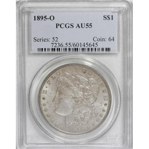 <B>1895-O $1 AU55 PCGS.</B></I> Soft cloud-gray patina graces the subtly lustrous surfaces of this lightly worn O-mint dollar, one that displays an unusually sharp strike at the hair above the ear. Highly appealing despite light, scattered abrasions and a desirable example of this key issue.<BR><BR><b>Shipping:</b> Coins & Currency (<a target="_blank" href="http://www.heritageauctions.com/common/shipping.php">view shipping information</a>)