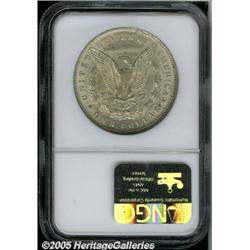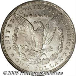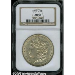 <B>1895-O<img border='0' src='http://www.heritagecoins.com/images/star.gif' width=10 height=10>$1 AU58 NGC.</B></I> Even though this piece is "only" an AU58, it is one that should be seriously considered by collectors of this popular series. Much of the mint luster still remains and the surfaces are bright and show only the slightest hint of color. The design elements are generally well defined, the only exceptions being softness in the hair above Liberty's ear and on the eagle's breast feathers. Superficial marks are at a minimum, with just a couple of very trivial ones on Liberty's cheek and neck, and in the upper reverse field. This piece would actually fit in quite well in an MS62-63 set, with considerable savings to the collector.