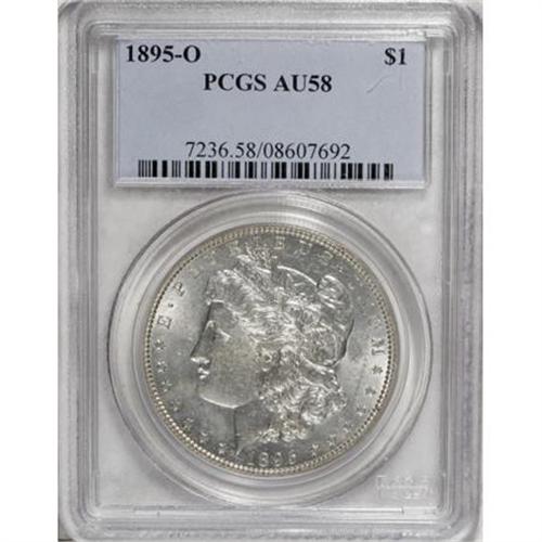 <B>1895-O $1 AU58 PCGS.</B></I> Light highpoint rub on the eagle's breast and other design highpoints barely separate this brilliant silver-white coin from Mint State. The few tiny, undistracting abrasions are consistent with the grade and a short spate in circulation. An appealing coin, and a good alternative to lower Mint State grades.<BR><BR><B>Coin Engraver:</B> George T. Morgan<BR><BR><b>Shipping:</b> Coins & Currency (<a target="_blank" href="http://www.heritageauctions.com/common/shipping.php">view shipping information</a>\)