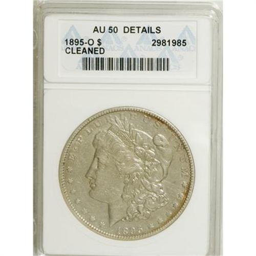 <B>1895-O $1 --Cleaned--ANACS. AU50 Details.</B></I> Dashes of orange patina cling to the borders. Luster emerges from the hair, wings, and legends. Subdued by a cleaning, but still a suitable example of this key New Orleans dollar.<BR><BR><b>Shipping:</b> Coins & Currency (<a target="_blank" href="http://www.heritageauctions.com/common/shipping.php">view shipping information</a>)