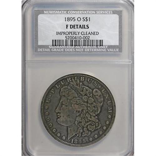 <B>1895-O $1 --Improperly Cleaned--NCS. F Details.</B></I> NGC Census: (0/0). PCGS Population (0/0). Mintage: 450,000. (#7236)<BR><BR><B>Coin Engraver:</B> George T. Morgan<BR><BR><b>Shipping:</b> Coins & Currency (<a target="_blank" href="http://www.heritageauctions.com/common/shipping.php">view shipping information</a>)