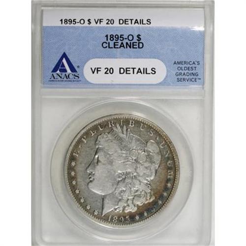 <B>1895-O $1 --Cleaned--ANACS. VF20 Details.</B></I> NGC Census: (38/2406). PCGS Population (77/2418). Mintage: 450,000. Numismedia Wsl. Price for NGC/PCGS coin in VF20: $525. (#7236)<BR><BR><B>Coin Engraver:</B> George T. Morgan<BR><BR><b>Shipping:</b> Coins & Currency (<a target="_blank" href="http://www.heritageauctions.com/common/shipping.php">view shipping information</a>)
