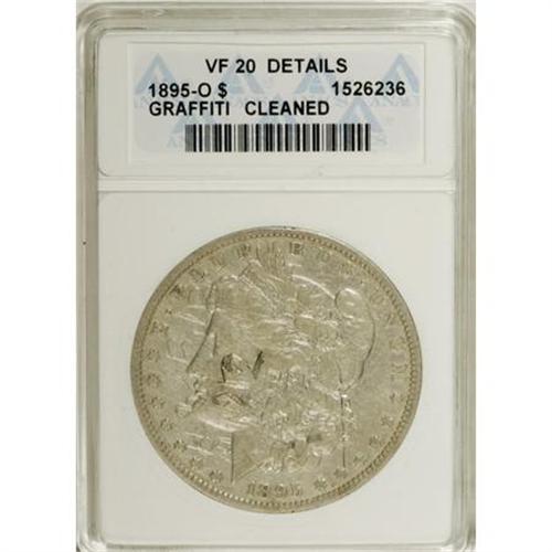 <B>1895-O $1 --Cleaned, Graffiti--ANACS. VF20 Details.</B></I> NGC Census: (219/2503). PCGS Population (66/2285). Mintage: 450,000. Numismedia Wsl. Price: $535. (#7236)<BR><BR><B>Coin Engraver:</B> George T. Morgan<BR><BR><b>Shipping:</b> Coins & Currency (<a target="_blank" href="http://www.heritageauctions.com/common/shipping.php">view shipping information</a>)