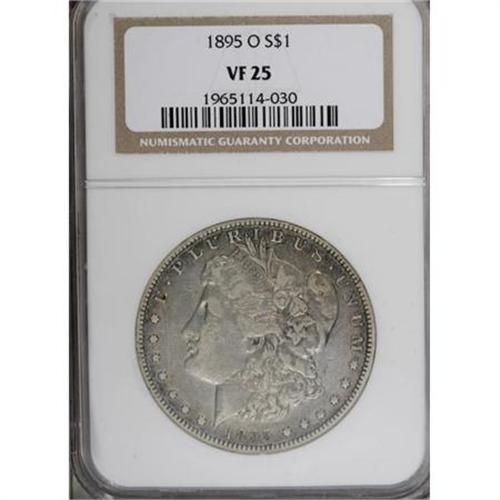 <B>1895-O $1 VF25 NGC.</B></I> NGC Census: (60/2398). PCGS Population (77/2362). Mintage: 450,000. Numismedia Wsl. Price for NGC/PCGS coin in VF25: $551. (#7236)<BR><BR><B>Coin Engraver:</B> George T. Morgan<BR><BR><b>Shipping:</b> Coins & Currency (<a target="_blank" href="http://www.heritageauctions.com/common/shipping.php">view shipping information</a>)