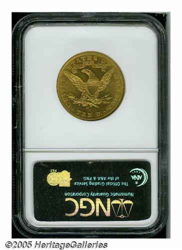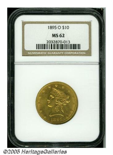<B>1895-O<$10> MS62 NGC.</B></I> Well struck with bright luster, good color, and a seemingly normal number of small abrasions, for the assigned grade level. This lower mintage issue is very scarce at MS62, and becomes rare any finer, with no example yet certified above MS63, by either of the major services. Population: 46 in 62, 7 finer (5/05).