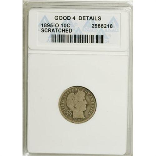 <B>1895-O 10C --Scratched--ANACS. Good 4 Details.</B></I> NGC Census: (8/100). PCGS Population (12/181). Mintage: 440,000. Numismedia Wsl. Price for NGC/PCGS coin in G4 : $317. (#4807)<BR><BR><B>Coin Engraver:</B> Charles E. Barber<BR><BR><b>Shipping:</b> Coins & Currency (<a target="_blank" href="http://www.heritageauctions.com/common/shipping.php">view shipping information</a>\)