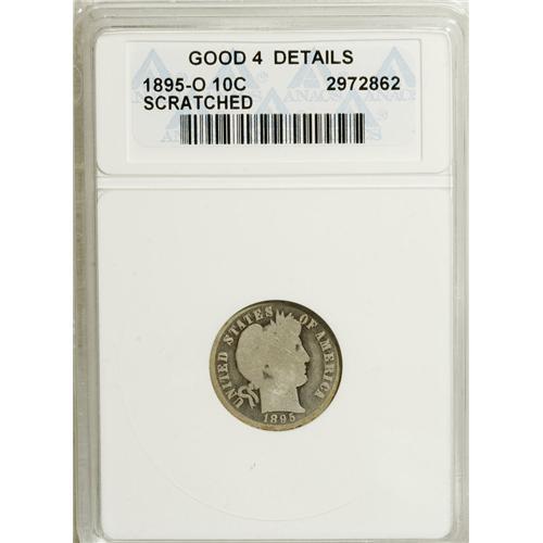 <B>1895-O 10C --Scratched--ANACS. Good 4 Details.</B></I> NGC Census: (21/256). PCGS Population (12/181). Mintage: 440,000. Numismedia Wsl. Price for NGC/PCGS coin in G4 : $317. (#4807)<BR><BR><b>Shipping:</b> Coins & Currency (<a target="_blank" href="http://www.heritageauctions.com/common/shipping.php">view shipping information</a>)