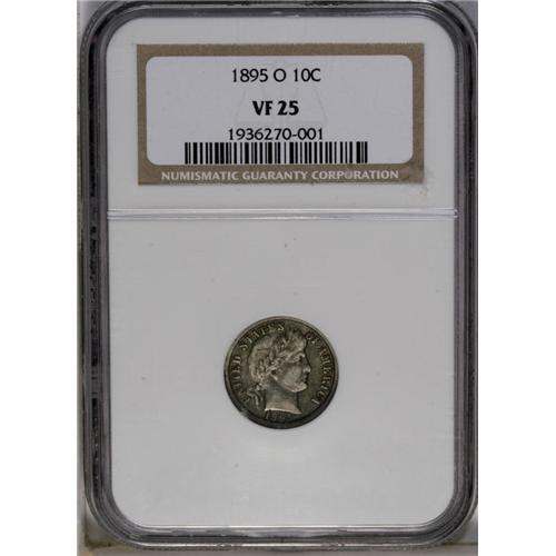 <B>1895-O<10C> VF25 NGC.</B></I> A pleasing gray-brown coin of this scarce date, with mostly even wear highlighted in dove-gray. An affordable and attractive circulated example.