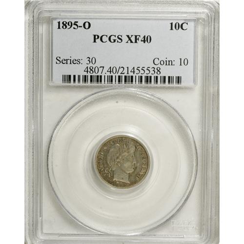 <B>1895-O 10C XF40 PCGS.</B></I> A pleasing example of this elusive date, second only to the legendary 1894-S for lowest population. This olive-gray piece has significant wear, though the broader details are still clear. Population: 12 in 40, 65 finer (10/06).<BR><BR><b>Shipping:</b> Coin/Currency (<a target="_blank" href="http://www.heritageauctions.com/common/shipping.php">view shipping information</a>)
