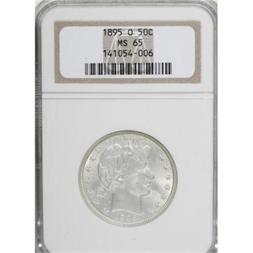 <B>1895-O 50C MS65 NGC.</B></I> This classy and elegant coin has a wonderfully bold strike for an O-mint Barber half, and the silver-white surfaces are remarkably clean. There are few coins better from a numeric standpoint, and it is difficult to imagine a finer piece aesthetically. Census: 7 in 65, 1 finer (1/08).<BR><I>From The Southwest Collection.</B></I><BR><BR><B>Coin Engraver:</B> Charles E. Barber<BR><BR><b>Shipping:</b> Coins & Currency (<a target="_blank" href="http://www.heritageauctions.com/common/shipping.php">view shipping information</a>)