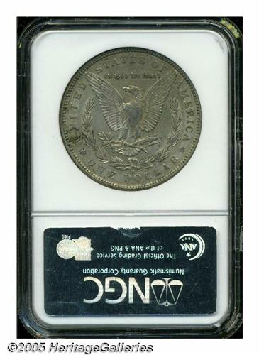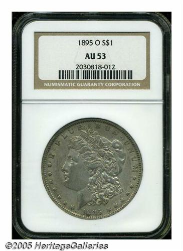<B>1895-O<S$1> AU53 NGC.</B></I> This key date Morgan representative displays light golden-gray patina with accents of sky-blue and lavender patina here and there, beneath which traces of luster are seen in the protected areas. The hair over Liberty's ear and the eagle's breast feathers are weak, but the remaining design elements exhibit good detail. A few minute marks on Liberty's cheek and in the left (facing) obverse field do not distract.